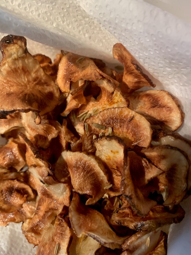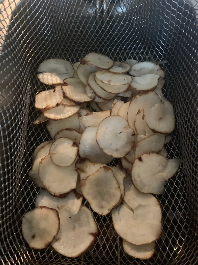 - Frituur de schijfjes aardpeer in de hete frituur op 170° tot ze beginnen kleuren.