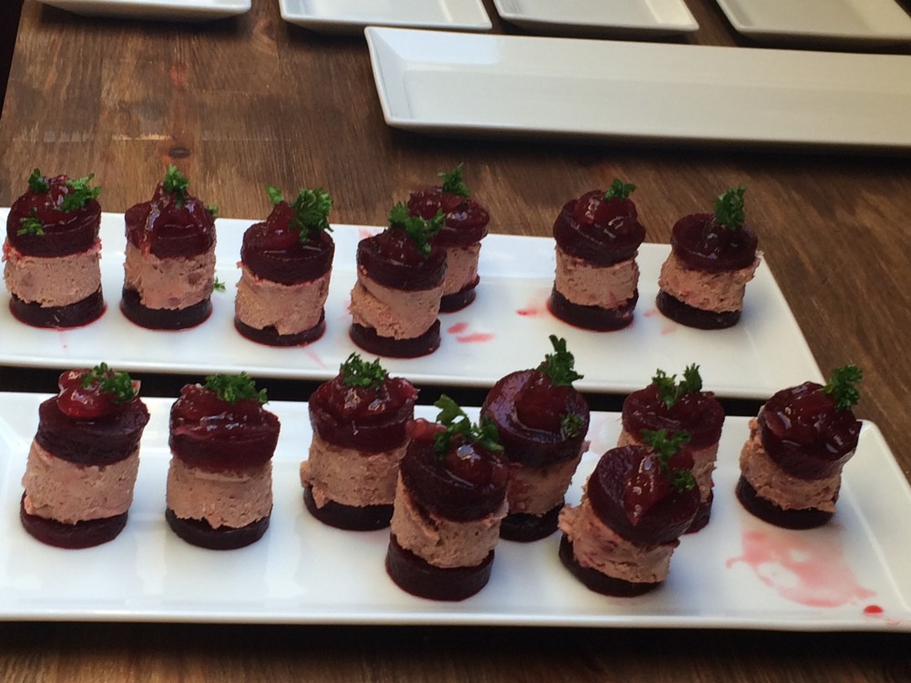 - Maak de torentjes met een schijfje rode biet, daarop een schijfje paté en tenslotte terug een schijfje rode biet.
