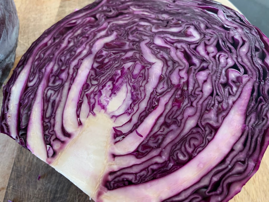 - Reinig de rode kool, verwijder de buitenste bladeren en snij de kool in vier.
