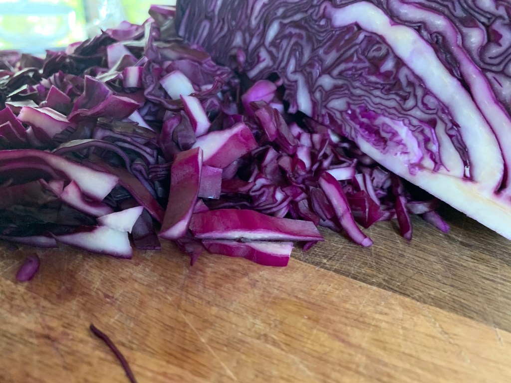 - Snij de harde nerven uit de kool en snij vervolgens in fijne dunne reepjes.