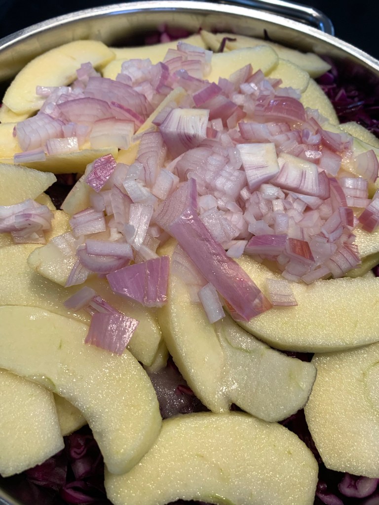 Heerlijke rode kool met appeltjes en een sjalotje, een echte klassieker. Lekker als bijgerecht bij bv stoverij of een lekker stukje vlees met jus. Je wordt gewoon vrolijk van die mooie kleur op je bord.