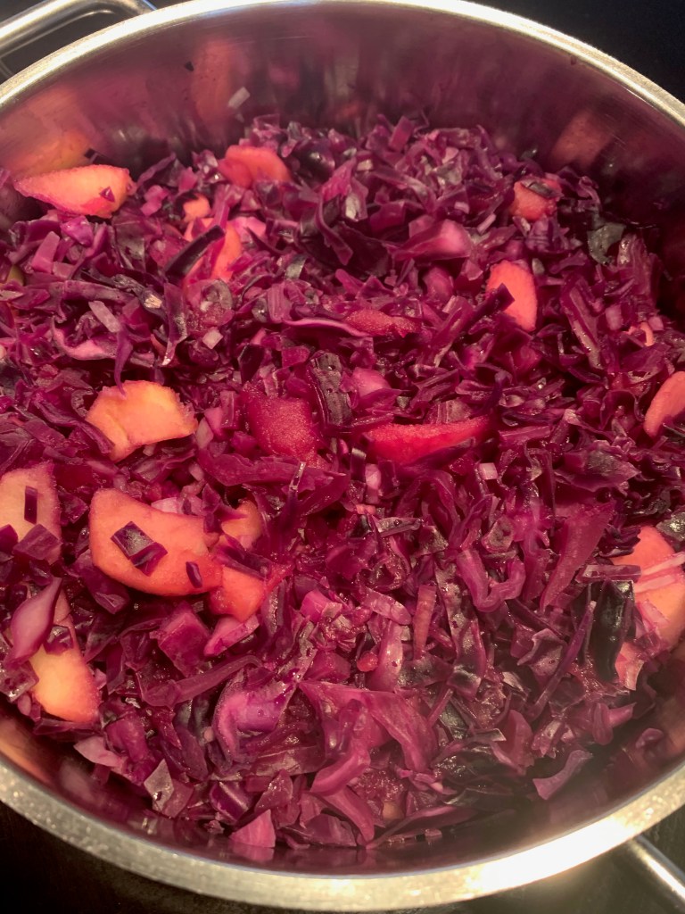 Je kan ook wat kaneelpoeder en rozijntjes toevoegen tijdens de bereiding van de rode kool.