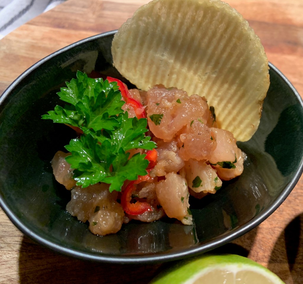 - Doe de tonijn tartaar in kleine individuele kommetjes en garneer met een gezouten ribbel chips en takje krul peterselie.