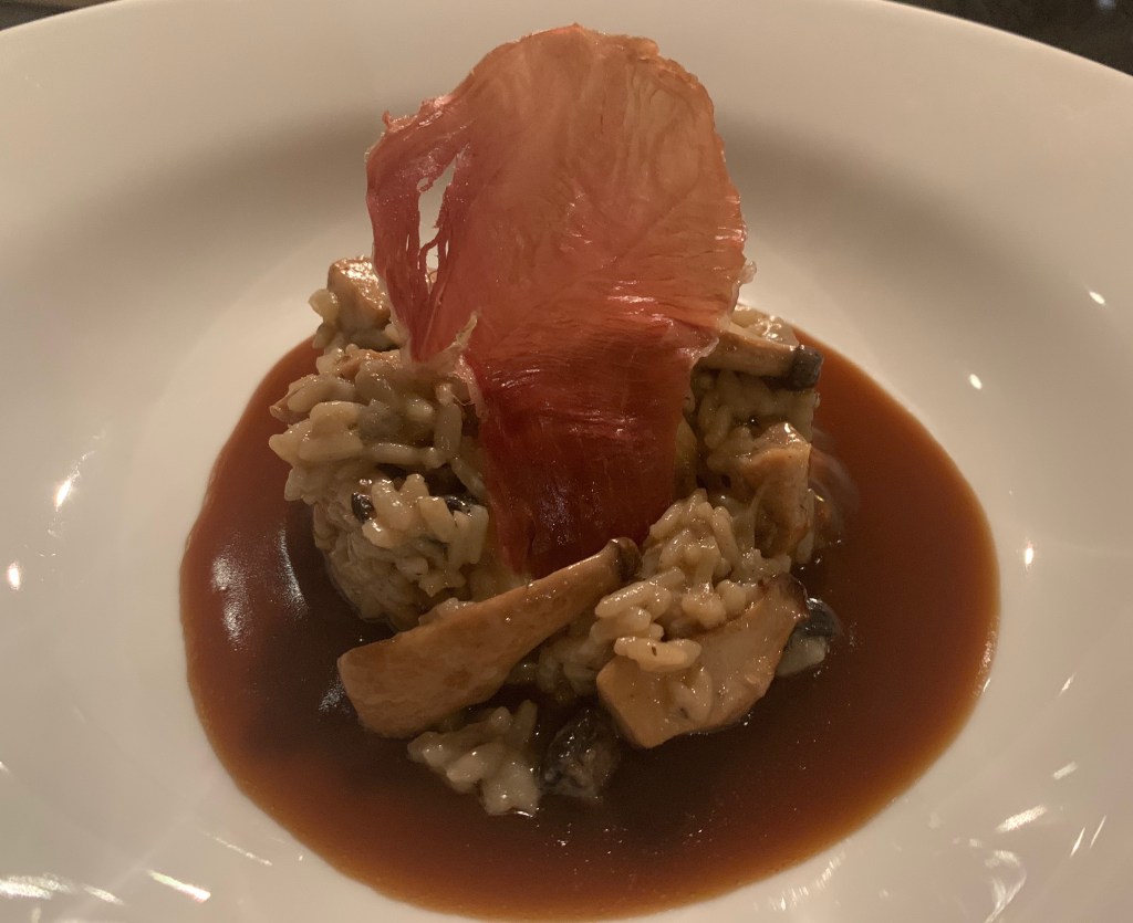 - Giet in een diep bord een lepel wildsaus en maak een mooi torentje risotto met behulp van een dresseer ring op de spiegel van wildsaus.
