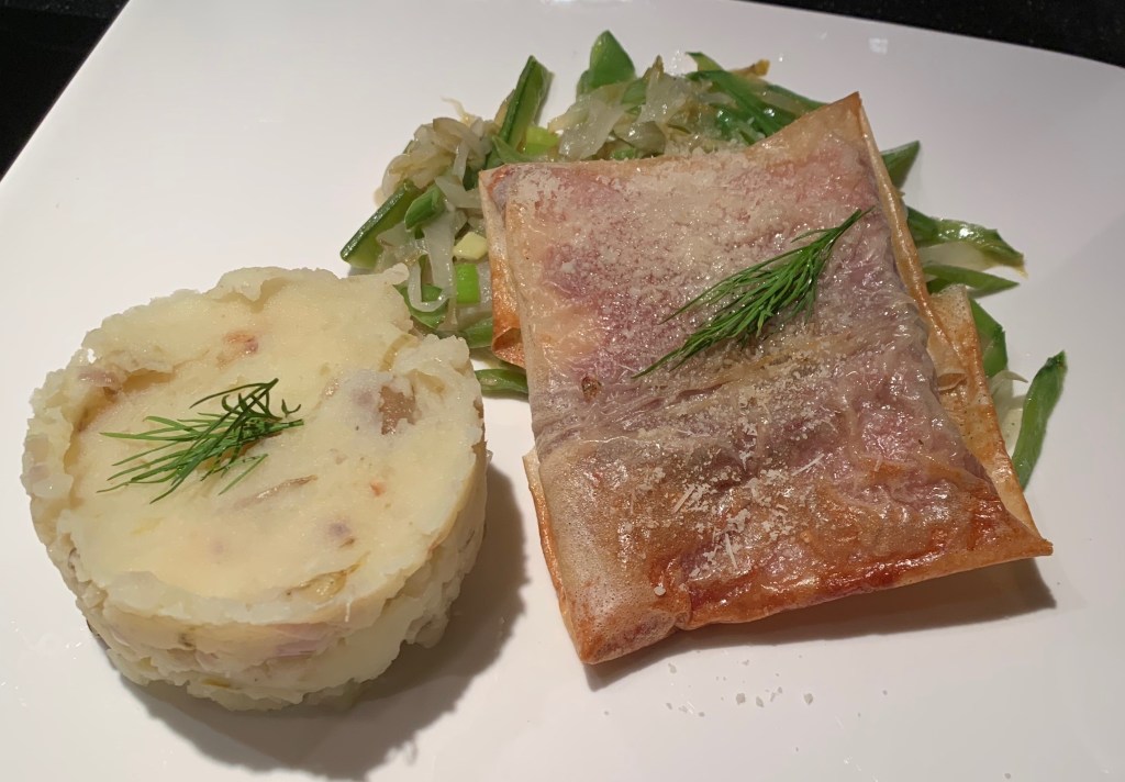 - Leg een vel brickdeeg voor je op het werkvlak en verdeel er twee sneetjes Ganda ham over en leg in het midden een stuk Kabeljauwfilet.