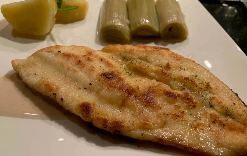 - Lepel een lepeltje saus op een bord en leg de gebakken pladijs filet erop, daarnaast schik je de prei stronkjes.