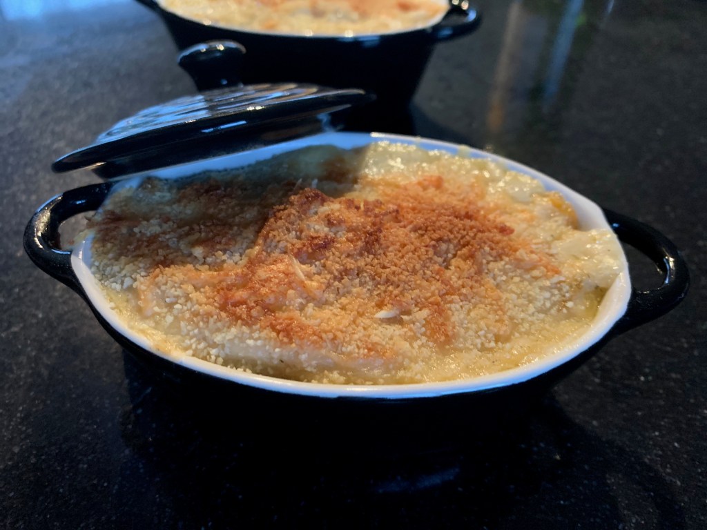 - Zet in een voorverwarmde oven op 180°C en draai de laatste minuten de oven op grill stand tot het vispannetje een mooi goud korstje krijgt.