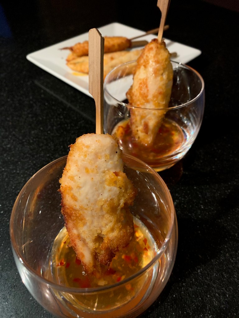 Een snel, makkelijk en lekker hapje. Dat zijn deze dunne kipfilet hapjes op een stokje, gepaneerd met panko en kipkruiden. Heerlijk met een chilisausje of loempiasaus als dip.