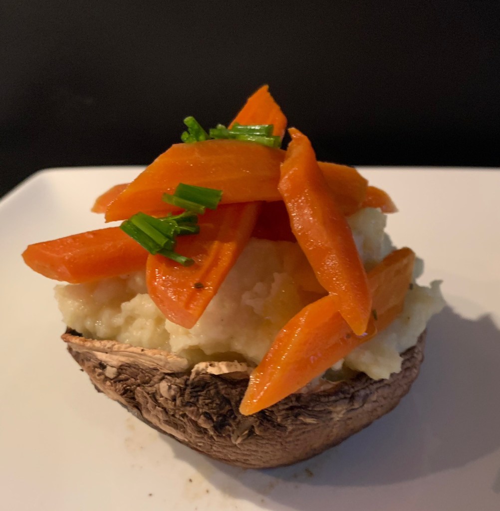 Portobello, een grote opvul champignon met vele mogelijkheden. Zo kan je deze vullen met gehakt of couscous of rijst,… noem maar op. Ditmaal heb ik de Portobello gevuld met pastinaak en worteltjes, geserveerd met een cilinder aardappeltje uit de oven en kippendijen. Je kan deze gevulde Portobello perfect als een vegetarisch (voor)gerechtje serveren, je zal heus geen stukje vlees missen op je bord.