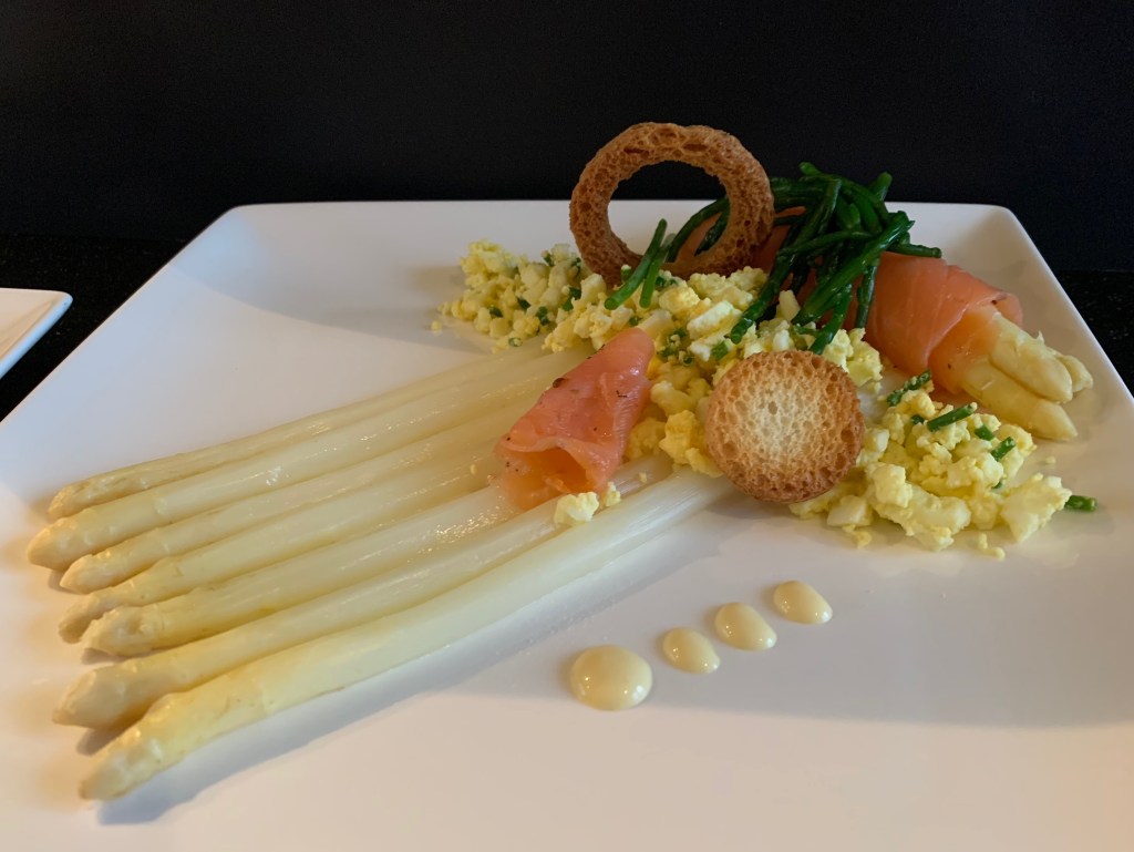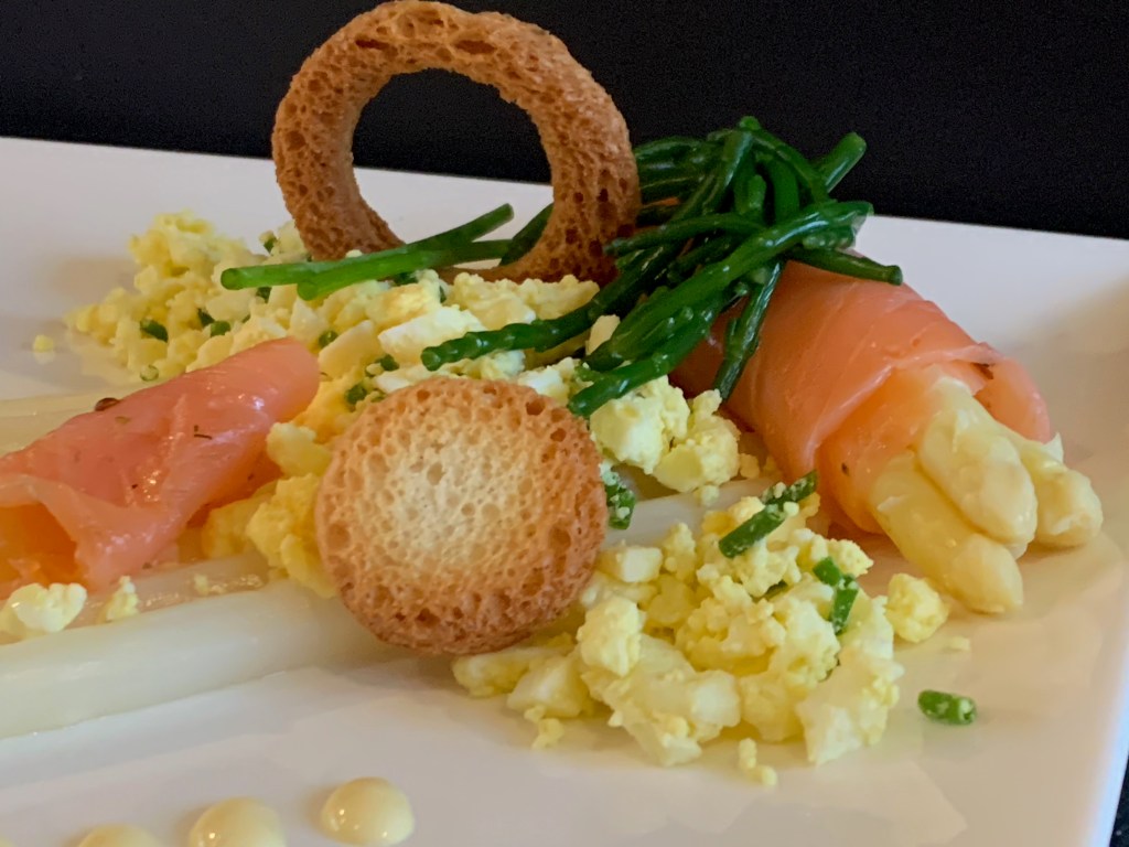 - Leg op het bord ook een zestal asperges per persoon, bestrooi met wat fijn geprakt ei en garneer het bord verder af met de zeekraal en het geroosterd toast brood. Schik er nog wat Gravad Lax zalm rondom.