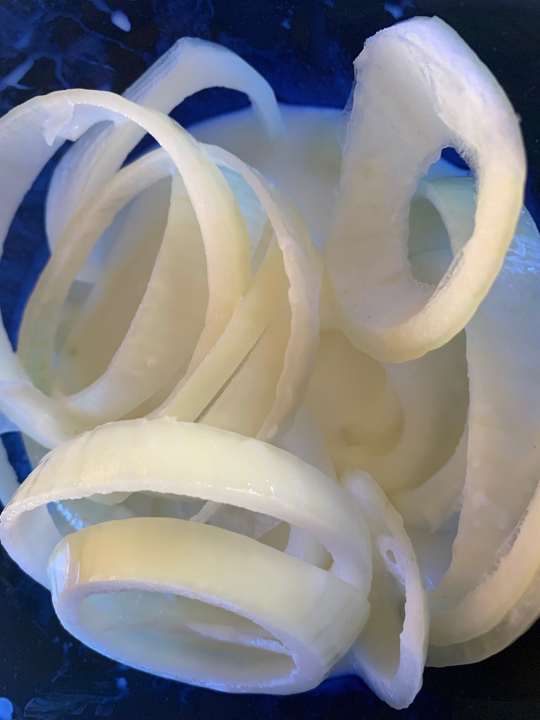 - Haal de ringen uit elkaar en leg ze in de karnemelk te marineren. Dit gedurende ongeveer 20 minuten.