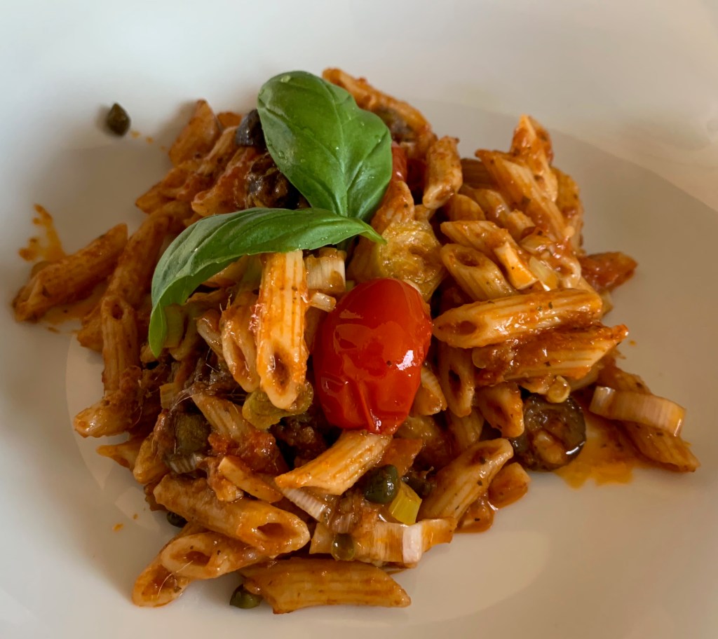 - Garneer met enkele blaadjes verse basilicum en dien op.