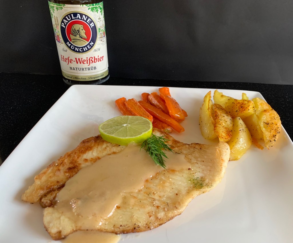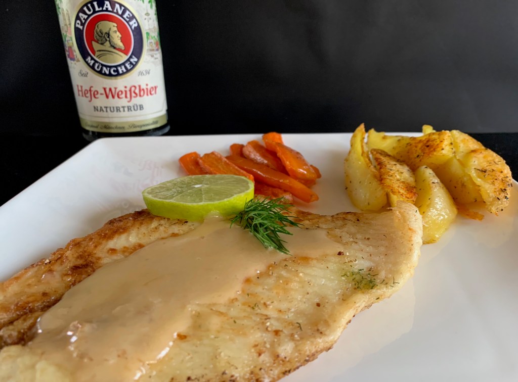 Neen, geen witte wijn saus maar een witbier sausje bij dit heerlijk stukje pladijsfilet. Het Weissbier van de Duitse brouwerij Paulaner leent zich hier uitstekend voor. Door zijn friszure smaak past dit perfect bij de vis.