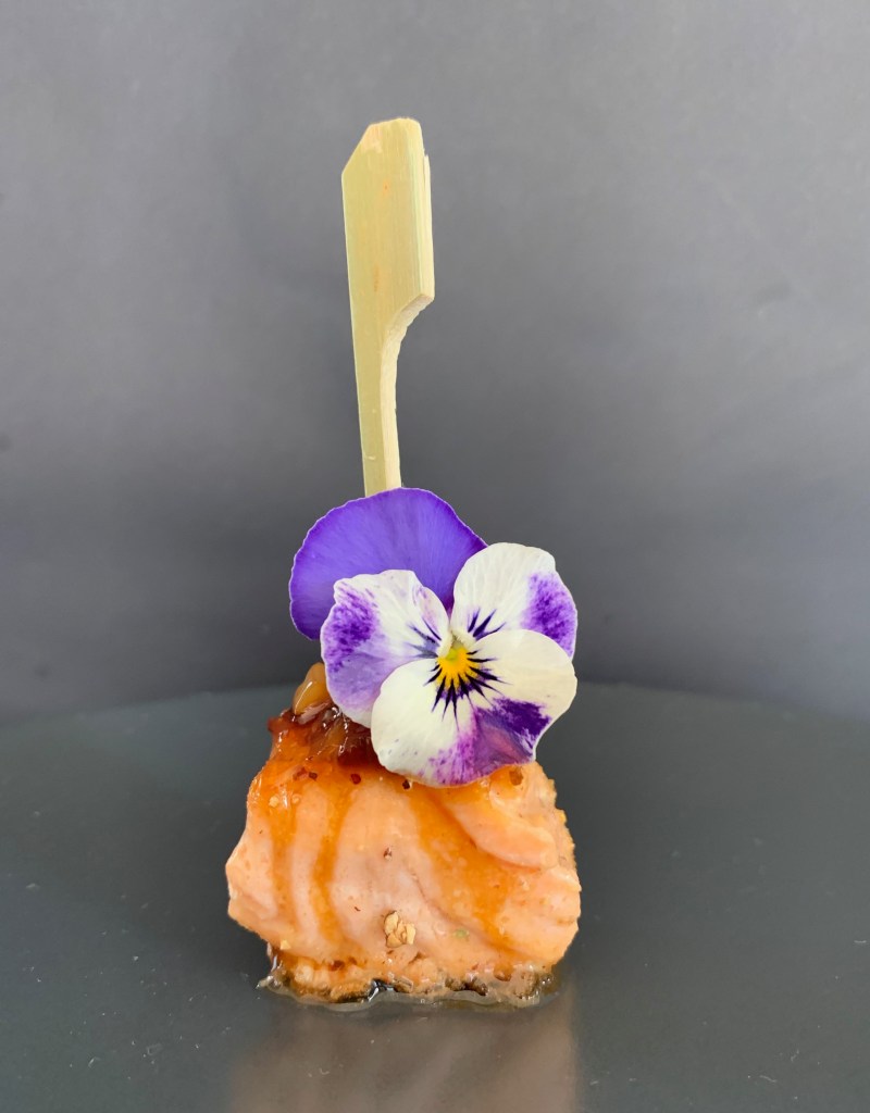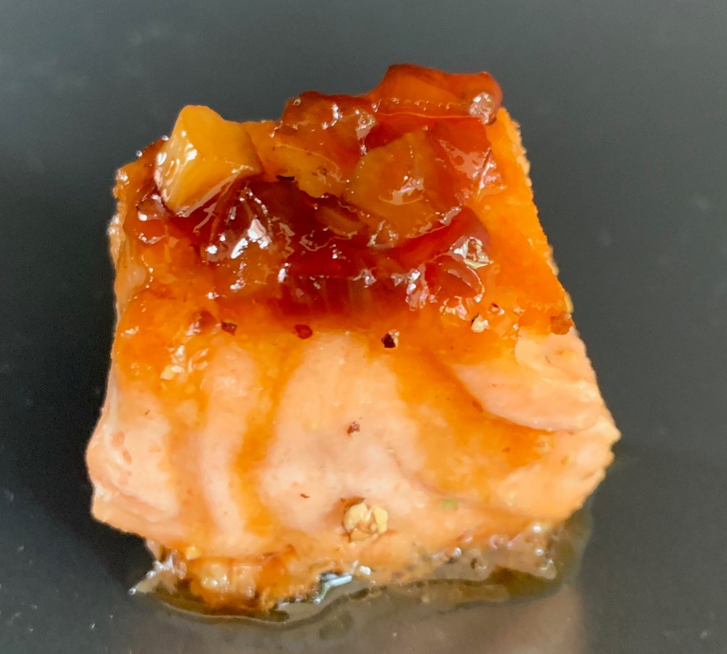 - Schik de zalm blokjes met de velkant naar beneden op een mooi bord, lepel er wat glazuur overheen en steek er een prikker in.