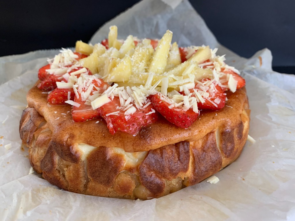 - Plaats even in de koelkast en garneer daarna de opgesteven cake met de aardbei schijfjes, geraspte witte chocolade, de ananasblokjes met geraspte kokos en lepel er wat ananassap met gelatine over uit.