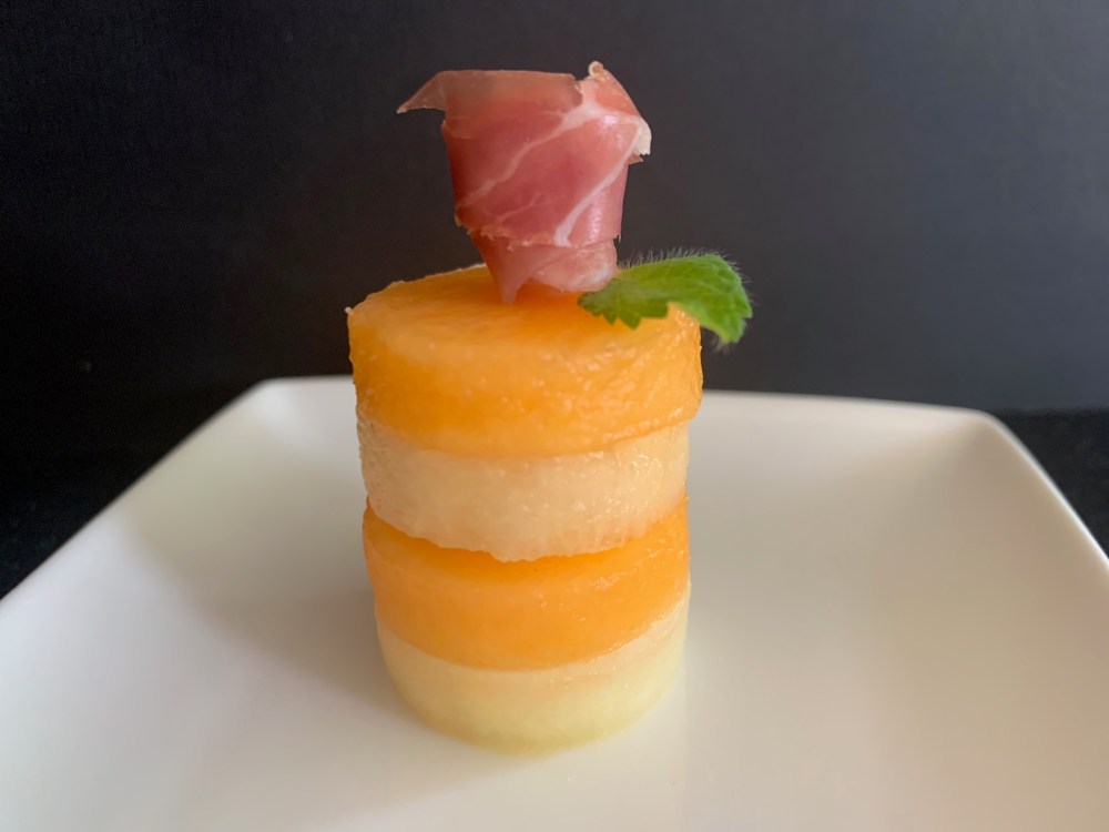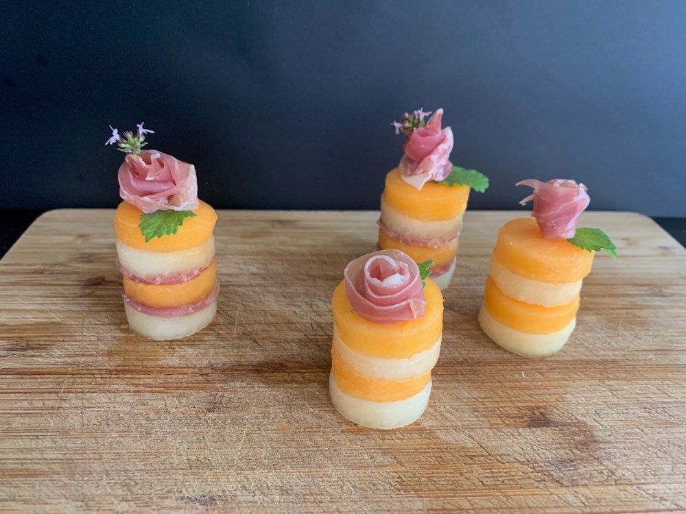 - Stapel de plakjes meloen op elkaar,Maak er vier met enkel meloen te beginnen met de Galia, Charentais, Galia en tot slot Charentais. Maak er nu vier met twee rondjes Ganda ham tussen de meloen.