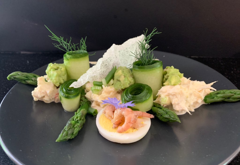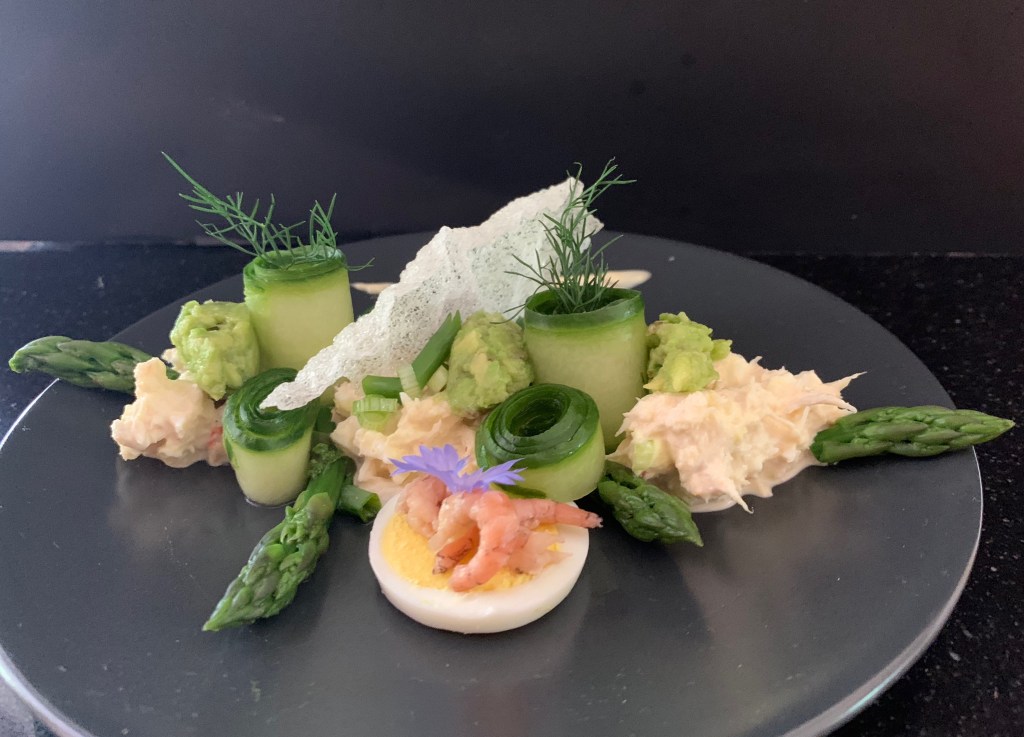 - Maak quenelles van de guacamole en schik op de krab sla.
