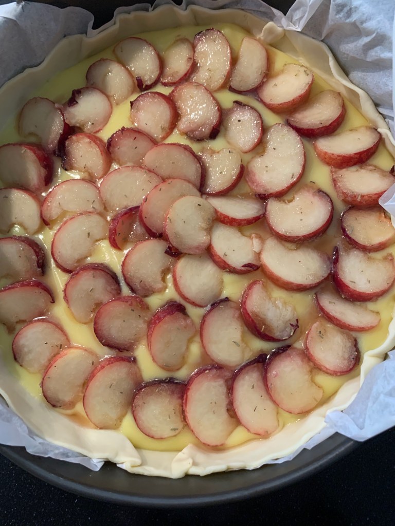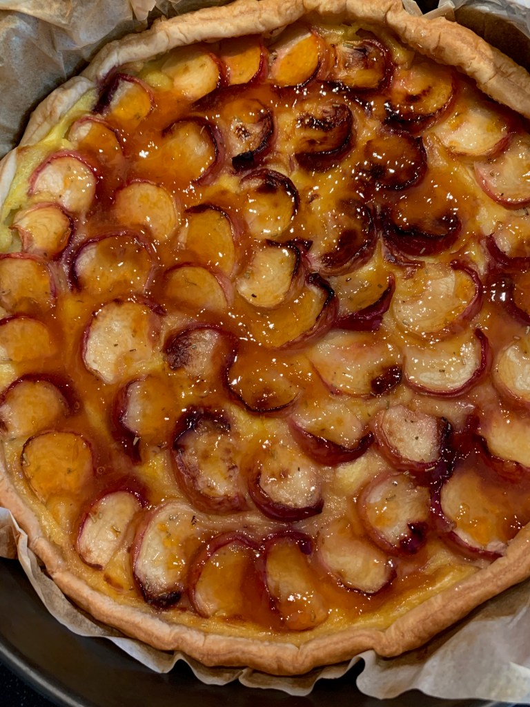 - Reken op ongeveer 30 minuten baktijd, dit naargelang het type oven. Zodra het bladerdeeg kleurt is de taart gaar.