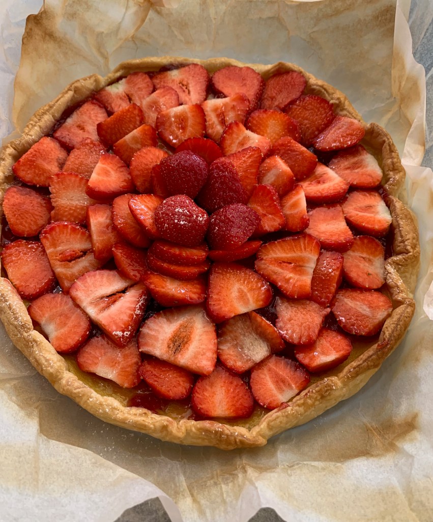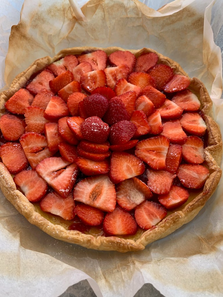 - Schik de gesneden aardbeien over de afgekoelde taart en de gehele aardbeien in het midden.