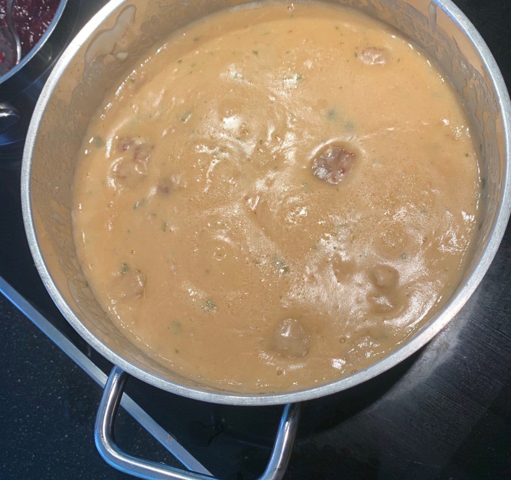 - Voeg geleidelijk de warme kalfsfond en gevogelte fond toe, blijf goed roeren met de garde.