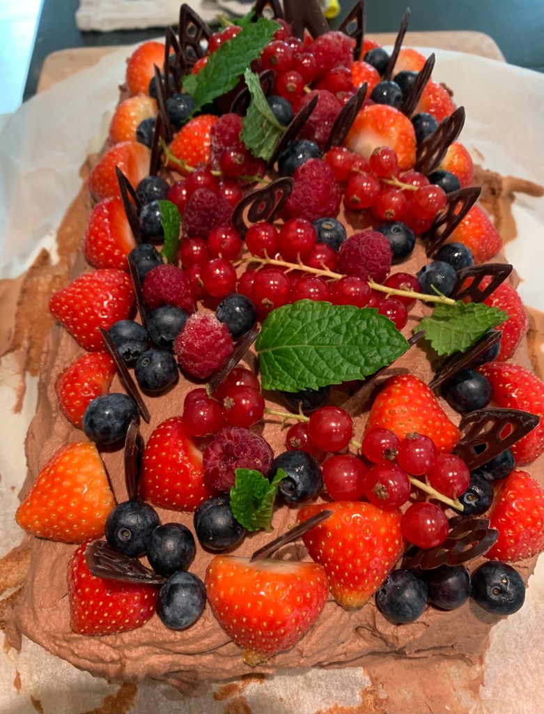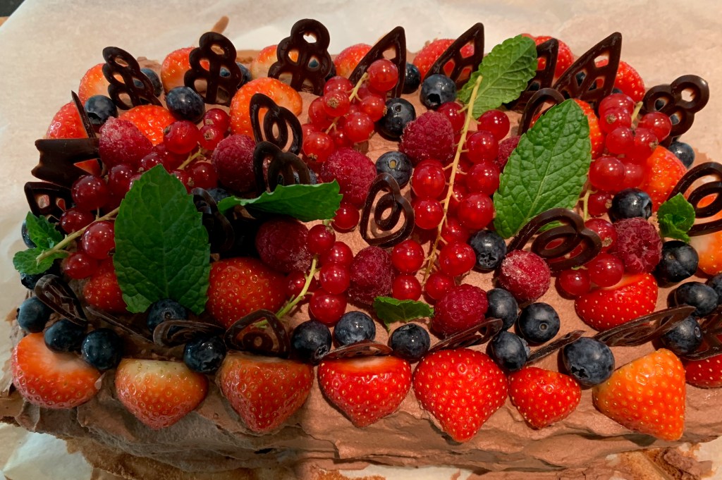 - Garneer de taart met rood fruit naar keuze,( bv. aardbeien, jeneverbesjes, frambozen, blauwe besjes), takjes munt en chocolade figuurtjes of geraspte chocolade.