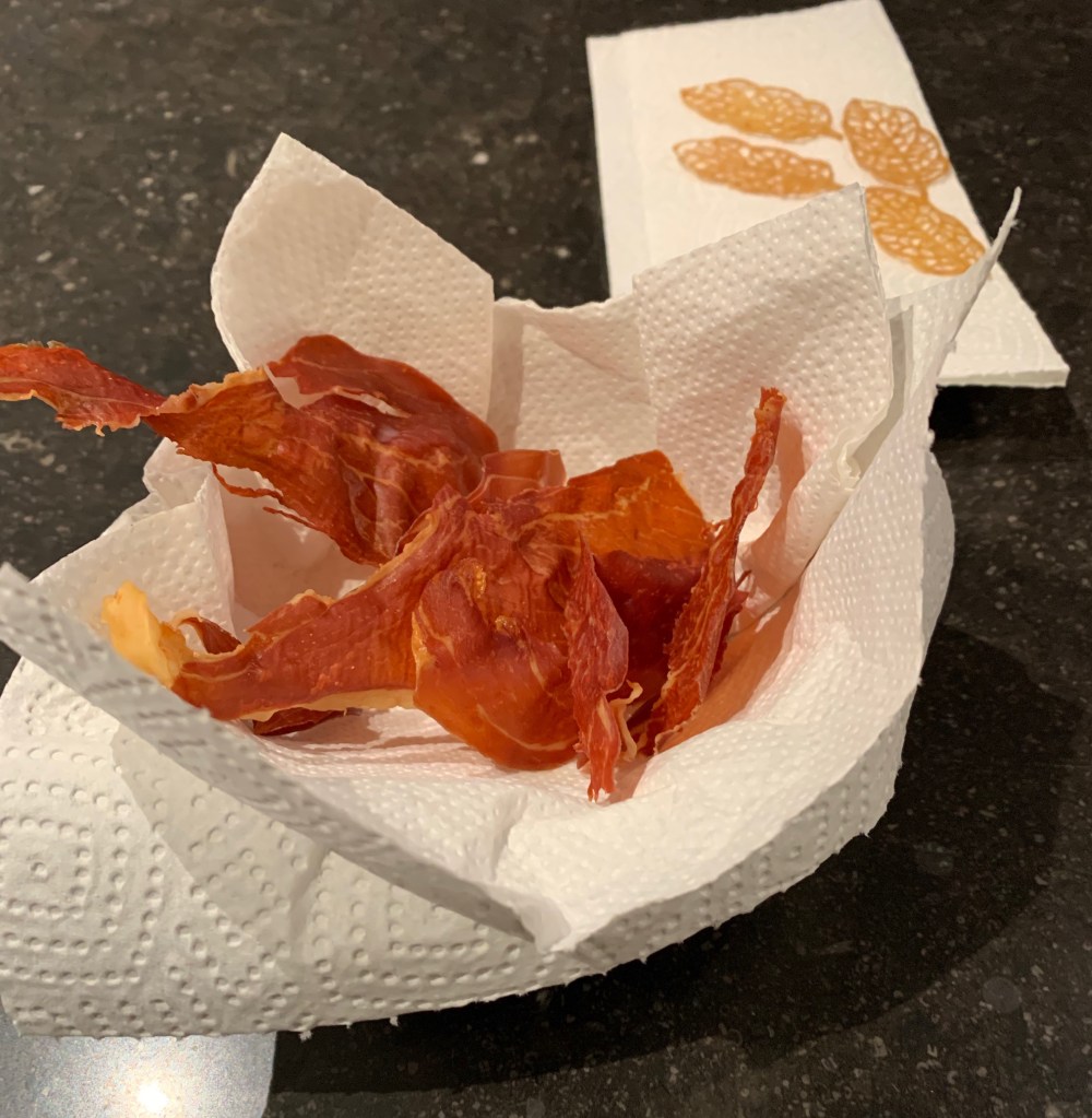 - Haal uit de oven en laat afkoelen op keukenpapier. Zet de Ganda ham chips opzij.