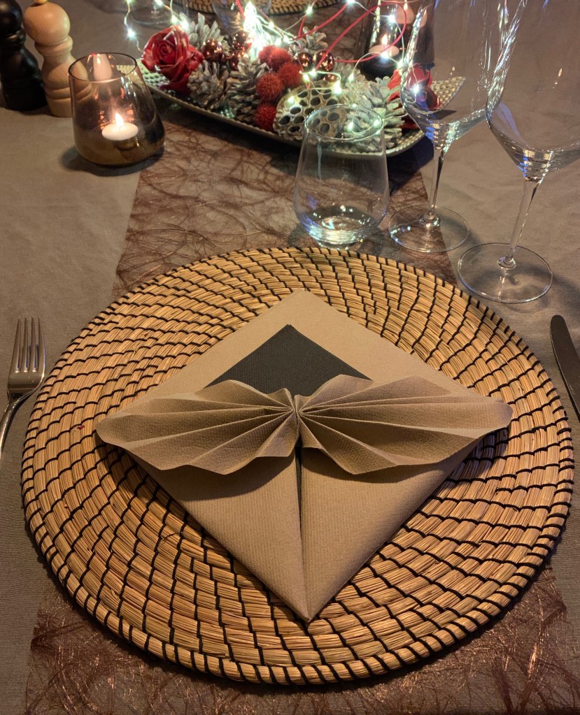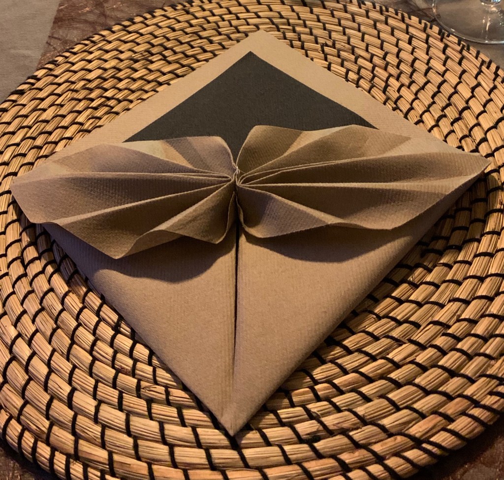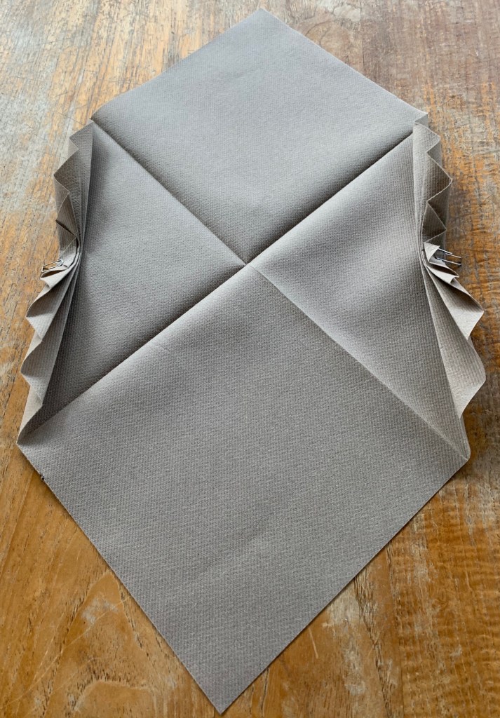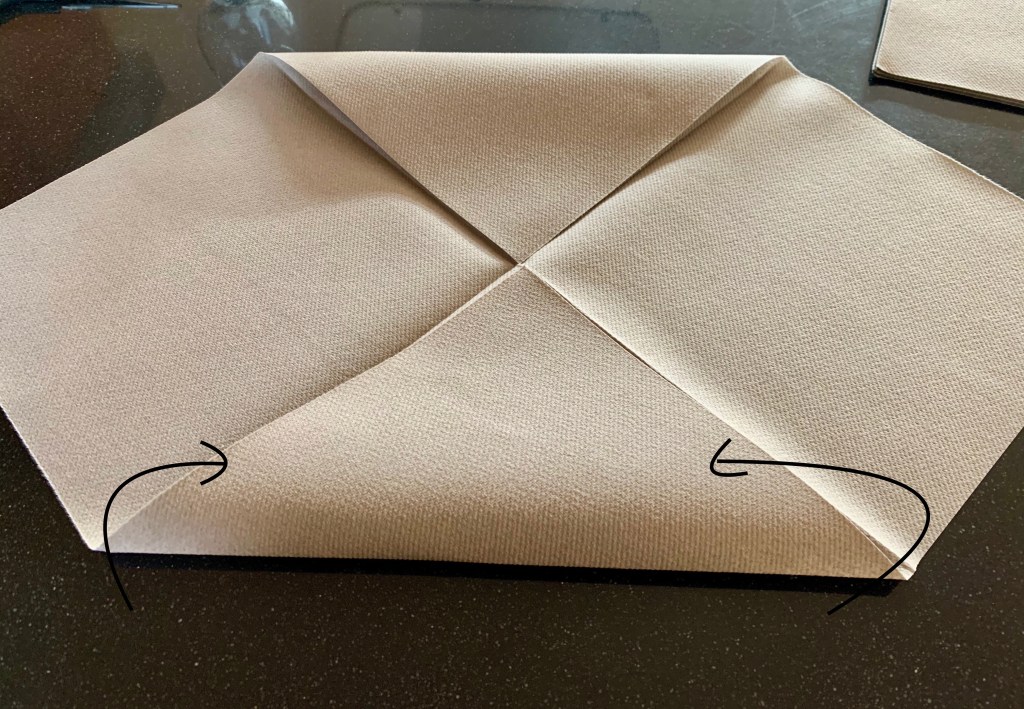 6. Draai de servet om en vouw ze mooi dubbel met de punten op elkaar (de harmonicadelen liggen links en rechts.)