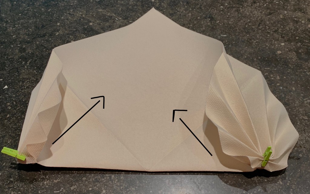 4. Vouw nu de onderste driehoek in een harmonica en zet vast met bv een paperclip