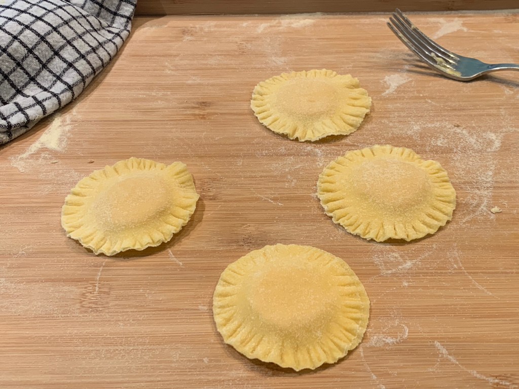 - Leg op 8 ronde pasta vellen een schijfje foie gras of Faux gras, leg er een tweede pasta vel bovenop en duw de randen goed tegen elkaar aan met behulp van een vork.