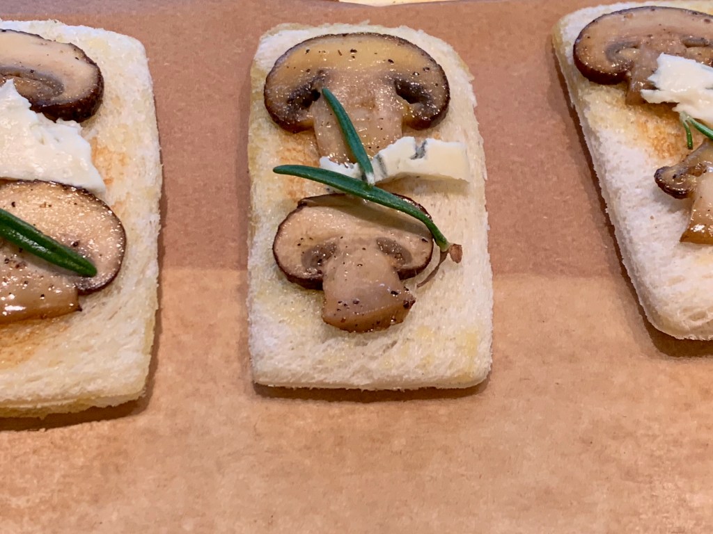 - Beleg ieder sneetje brood met 2 schijfjes gebakken champignons, een beetje blauw geaderde kaas en een vers rozemarijnblaadje.