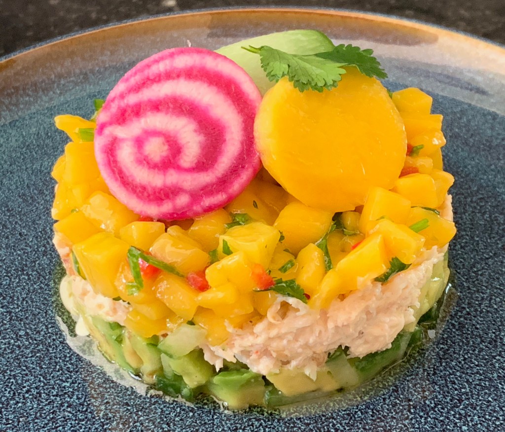 - Vervolgens een laagje krab en tot slot de mango salsa. Druk goed aan en verwijder voorzichtig de ring.