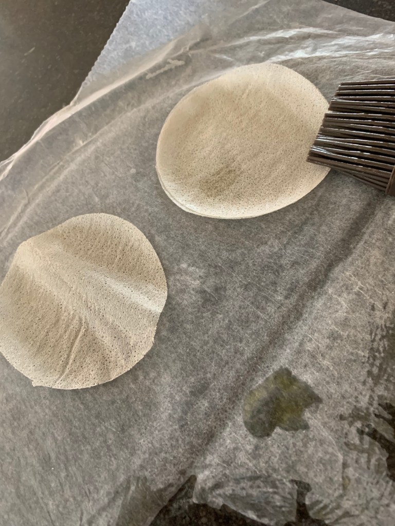 - Bestrijk de rondjes met olijfolie en schik er een tweede rondje brickdeeg bovenop.