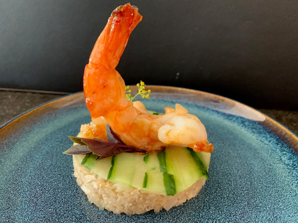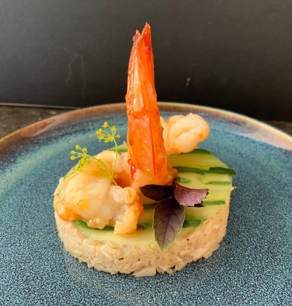 Onlangs had ik uit het versvak bij de supermarkt een zakje bloemkoolrijst meegebracht. Hiermee maakte ik dit verrassend lekker hapje met scampi.