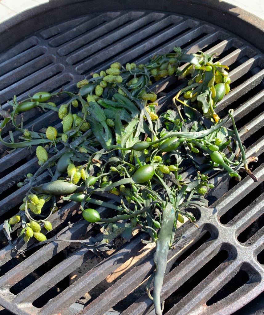 - Als de Egg op temperatuur is verdeel je het gespoelde zeewier over het rooster en sluit het deksel van de bbq.