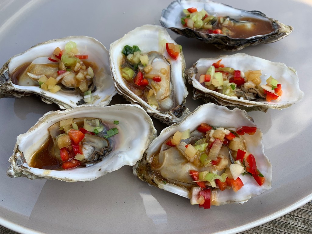 - Verdeel de oesters op een bord en schep een koffielepel van de dressing op iedere oester.