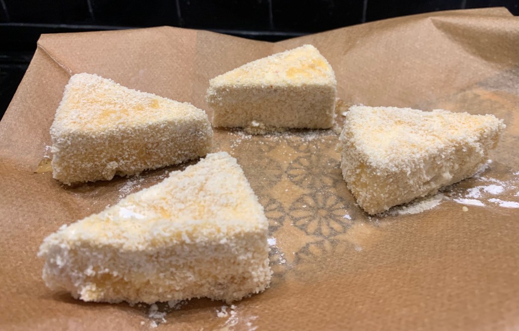 - Wentel de punten brie één voor één door het losgeklopt ei en vervolgens door de bloem. Nog niet door het paneermeel, is voor de laatste wenteling.