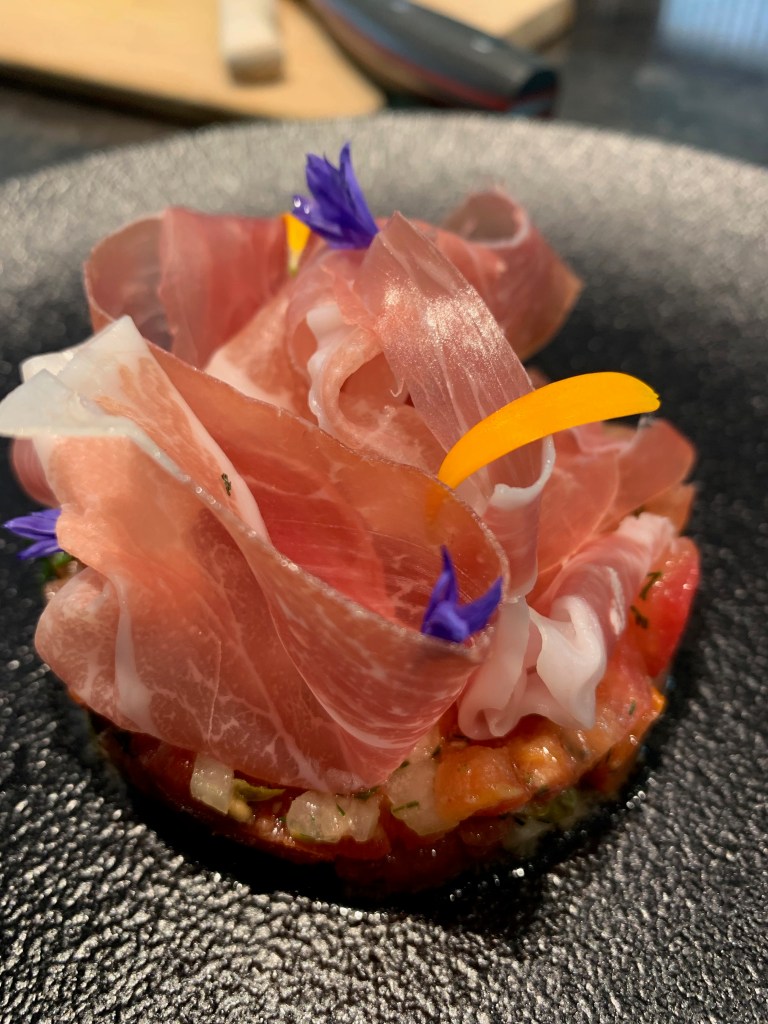 Een heerlijk fris voorgerecht is deze tartaar van tomaat. De parmaham kan je perfect weglaten, want de tartaar zit vol smaken zodat de vegetarische gast ook tevreden is.