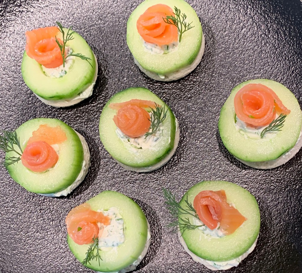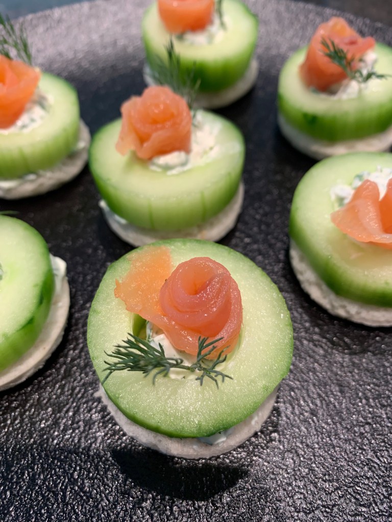 Een makkelijk en lekker hapje zijn deze canapé’s van komkommer en dille en daar past gerookte zalm uitstekend bij. Door de gerookte zalm tot roosjes te draaien, krijgt het nog een leuk uitzicht ook.