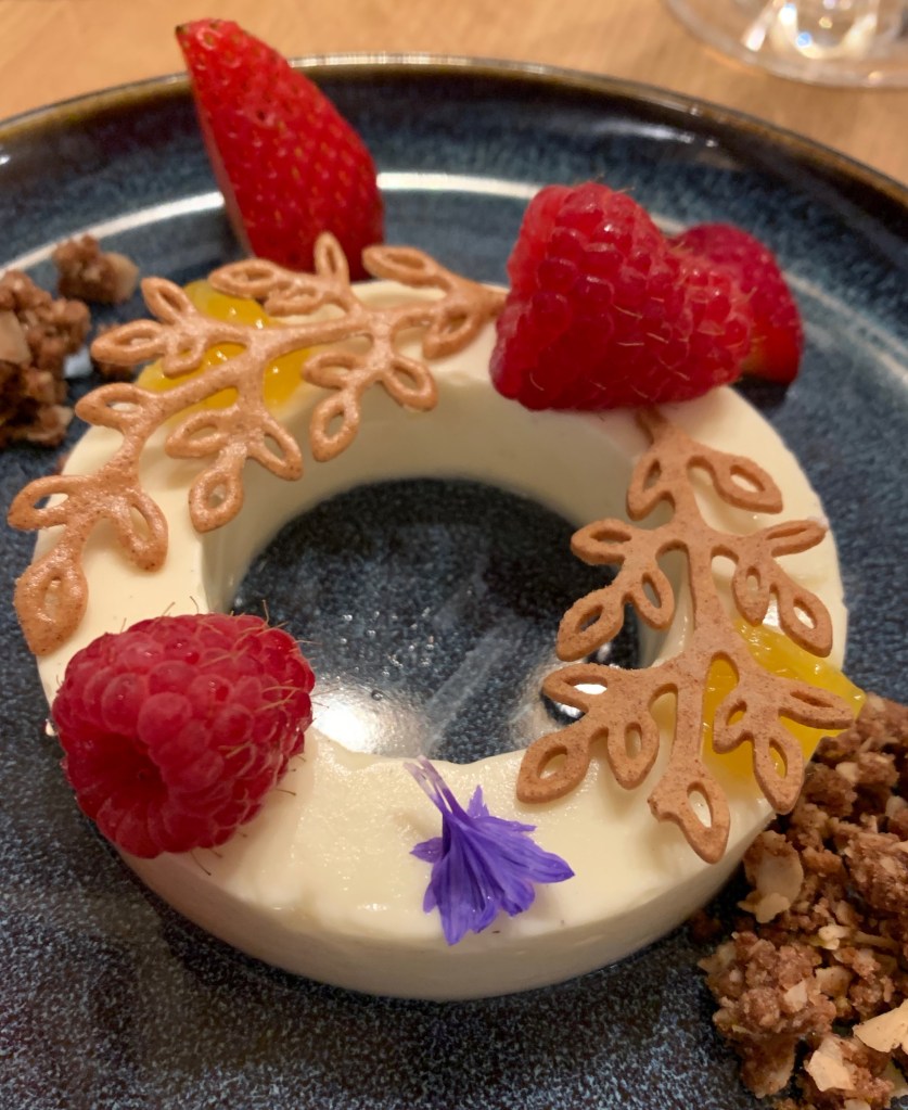 Heb je deze lekkernij in glaasjes gemaakt, verdeel na het opstijven er dan wat crumble over, enkele toefjes lemon curd, wat aardbeien en frambozen en garneer met een kaneel tuile .