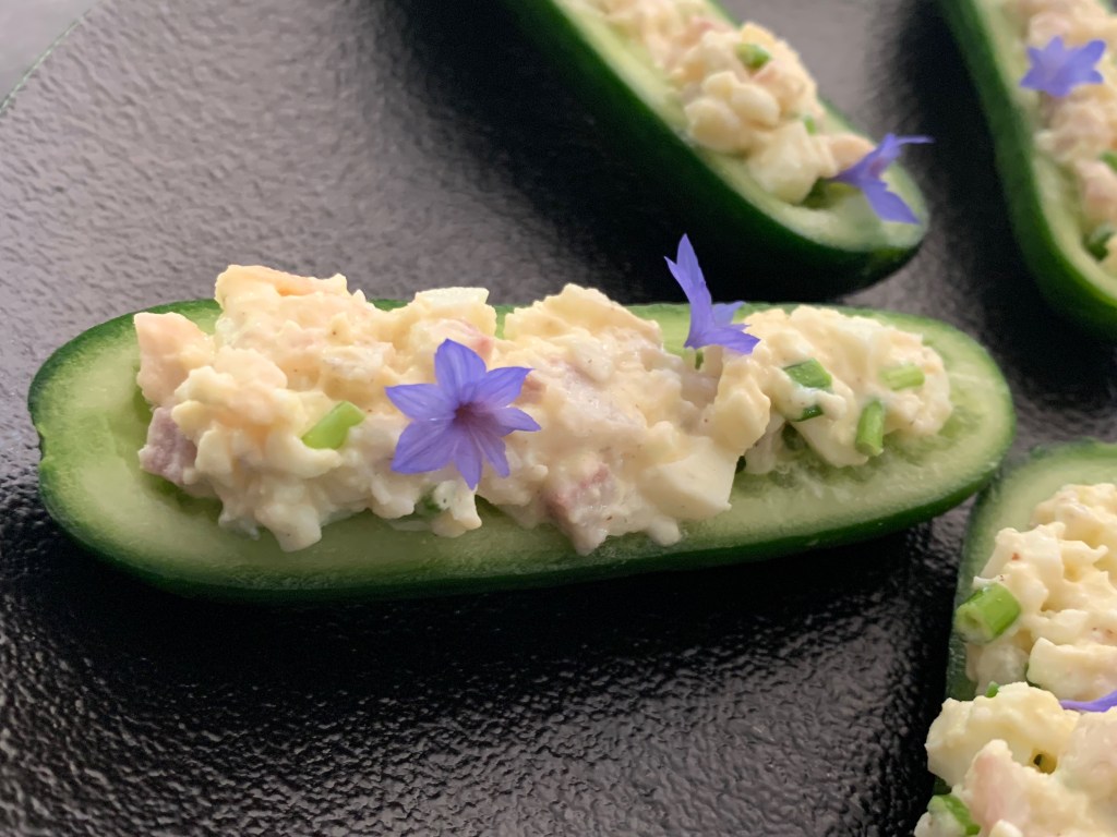 Mini komkommers gevuld met een salade van gerookte paling, heerlijk …en snel klaar.