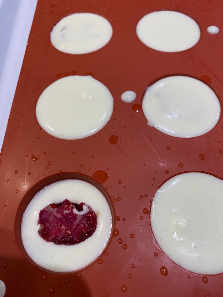 - Schep het rode uienconfijt in kleine siliconen vormpjes, kleiner dan de vorm waarin je de roquefort mousse gaat ingieten.