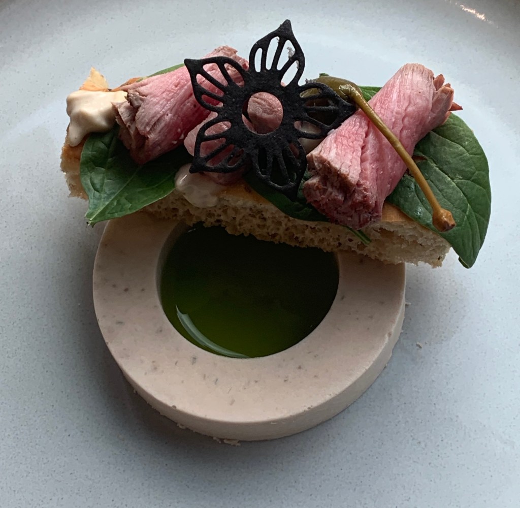 - Leg een sneetje focaccio op een ring, garneer met blaadjes spinazie, enkele toefjes saus, rolletje vlees en enkele kubusjes tonijn. Nog een appelkappertje en een krokantje van inktvis (optioneel)