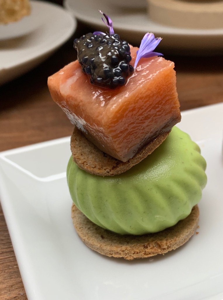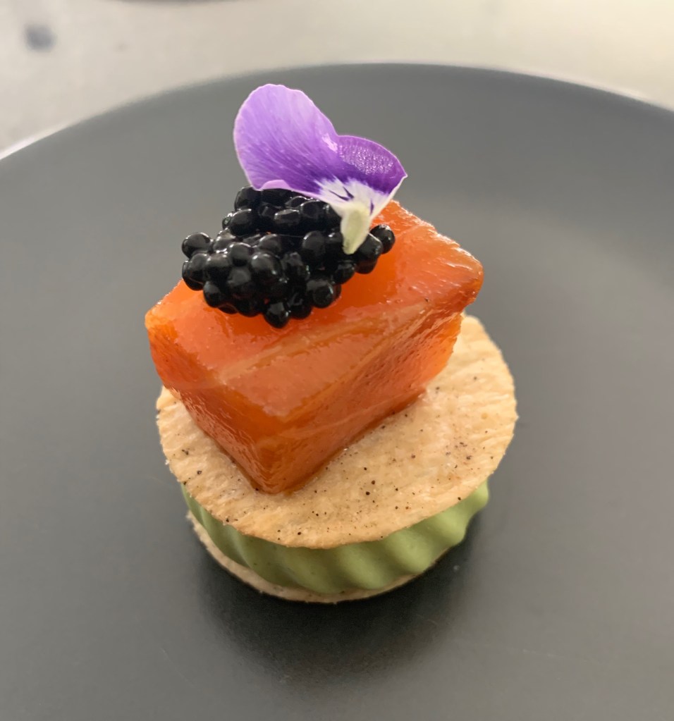 - Laat de gemarineerde zalm uitlekken en schik op iedere panna cotta een zalm dobbelsteentje.