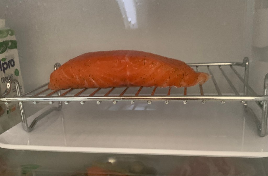 - Neem een rooster en leg er de zalm op, laat de zalm onafgedekt op het rooster in de koelkast circa 15 à 17 uur drogen.