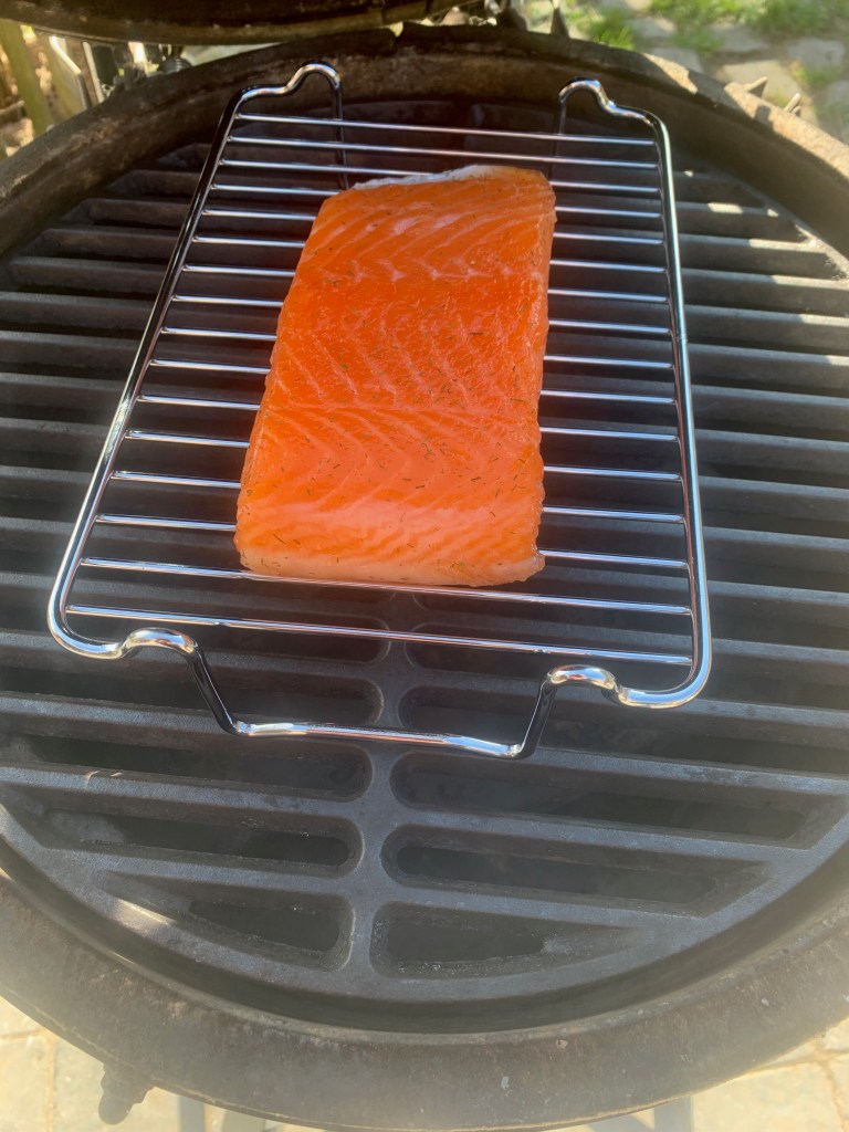 - Leg de zalm met het rooster in de kamado en laat circa 10 uur roken op de velkant.