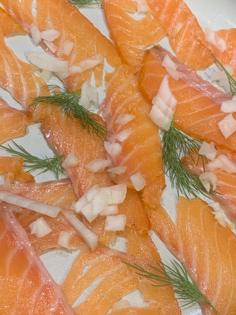 - Doe er wat plastic folie overheen en zet iets zwaar (bv.een blik conserven) erboven op en plaats in de koelkast. Laat de zalm 24 uur pekelen.