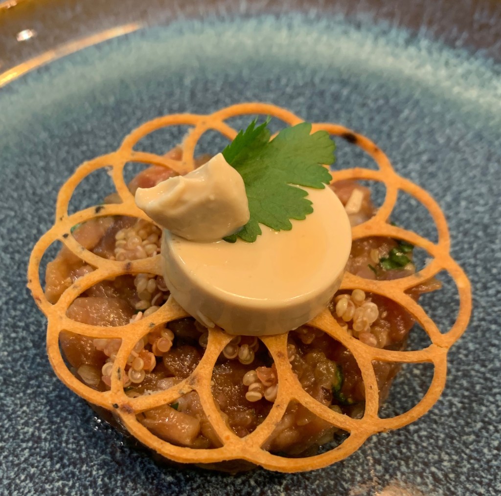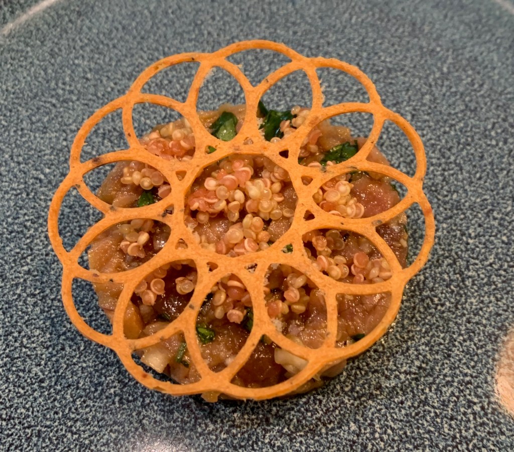 - Lepel wat van de quinoa op de tartaar, verdeel er enkele graantjes over uit.