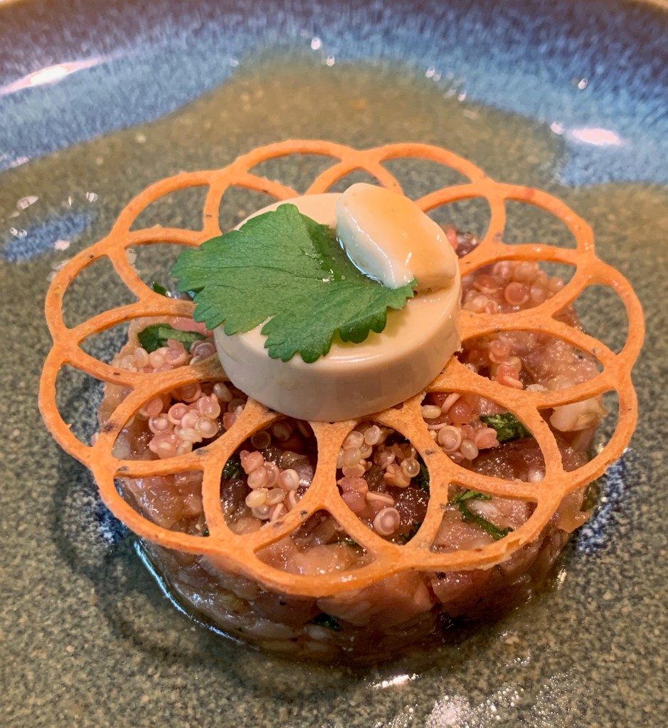 - Giet aan tafel de miso bouillon op het bord rondom de tartaar.