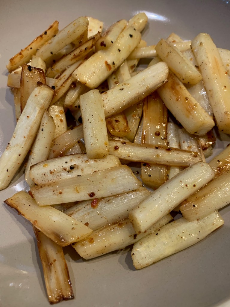 De dikkere asperges exemplaren snij ik na het schillen in de lengte doormidden en vervolgens in stukken van zo’n vijf centimeter. In feite is dit gerecht zo makkelijk dat je het eigenlijk geen recept kunt noemen. Maar het is zo lekker …