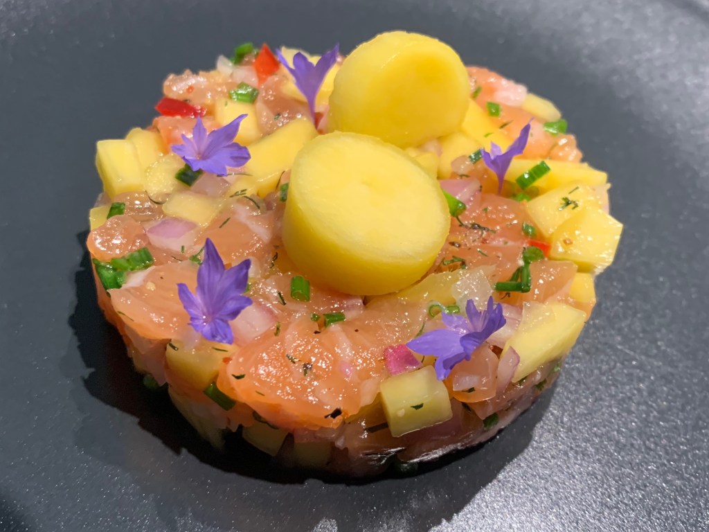 - Neem een grote metalen ronde dresseer vorm en vul met de zalm tartaar met mango, druk goed aan met behulp van de bolle kant van een eetlepel.